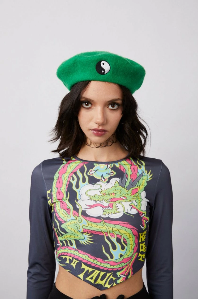 Embroidered Beret with Yang & Yang Symbol in Green.