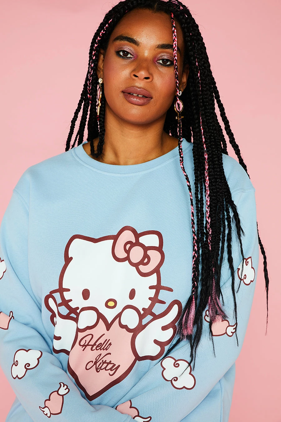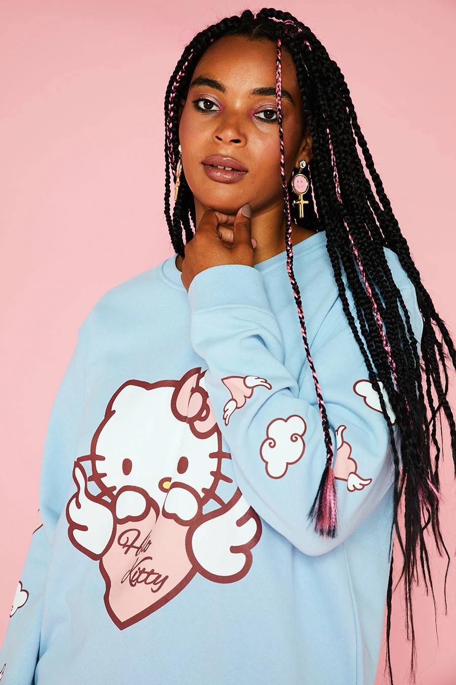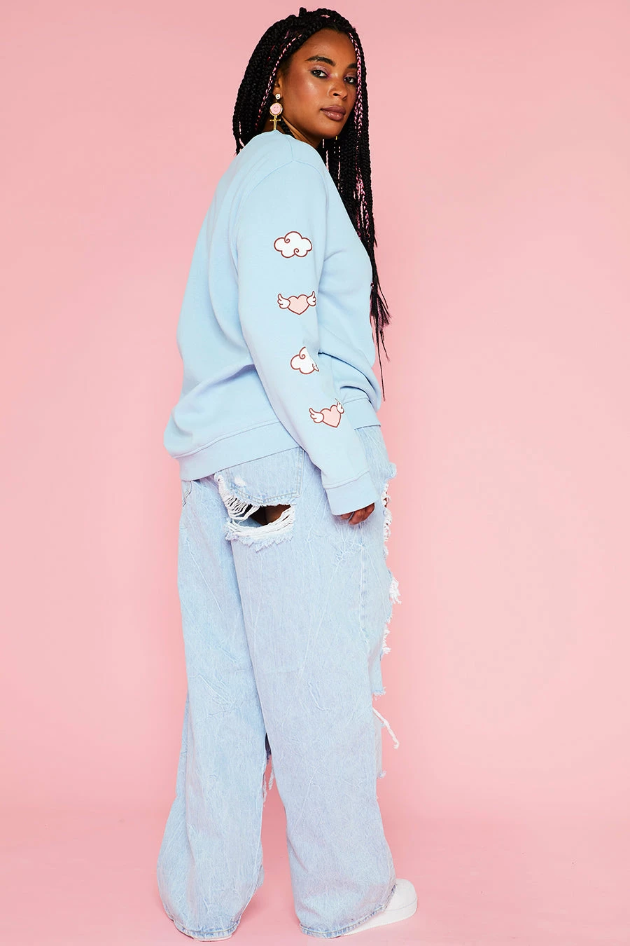 – Pastel blue sweater with white & pink, sleeve and front print detail